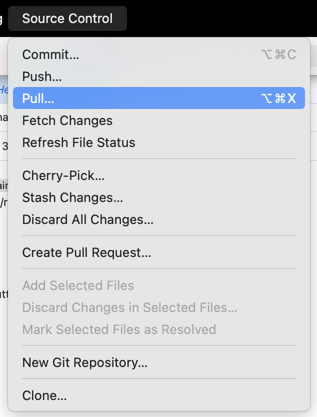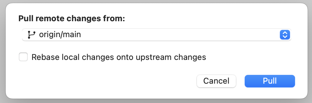 ==> 근본적인 원인은 pull을 안했다는 거니깐, Xcode에서 pull을 했다. (Rebase local changes onto upstream changes.는 체크하지 않았는데, 필요에 따라 체크하면 될 것 같다)