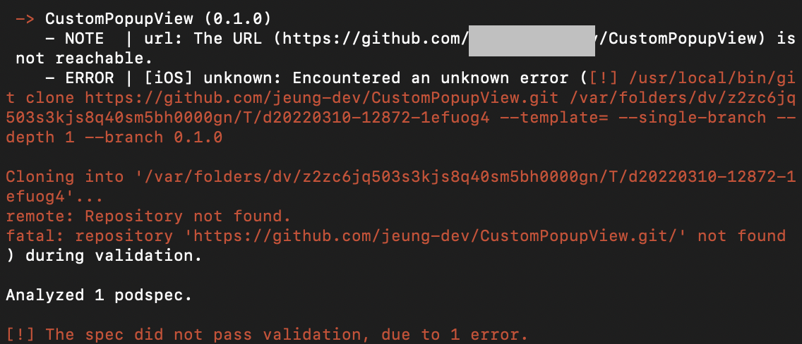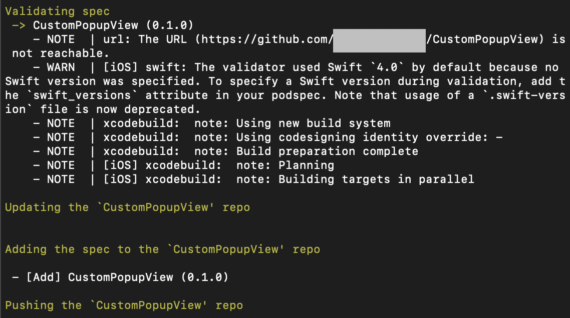 pod repo push [REPO_NAME] [라이브러리 폴더 안에있는 .podspec경로] --allow-warnings
