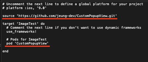 pod '라이브러리이름' 적은 뒤에 저장하고,